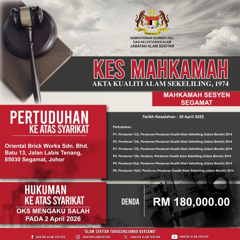 3 MAC 2026, SEGAMAT – Sebuah syarikat yang terlibat dalam aktiviti pembuatan batu bata di Labis, Segamat telah disabitkan kesalahan dengan hukuman denda sebanyak RM 180,000 di Mahkamah Sesyen Segamat pada 2 April 2026. Tertuduh telah membuat pengakuan bersalah bagi pertuduhan-pertuduhan di bawah Peraturan 7(3), 7(4), 7(5), 7(6), 9(a) dan 16(2), Peraturan-Peraturan Kualiti Alam Sekeliling (Udara Bersih) 2014, Akta Kualiti Alam Sekeliling 1974 di hadapan Hakim, Puan Rahimah binti Ab Majid.