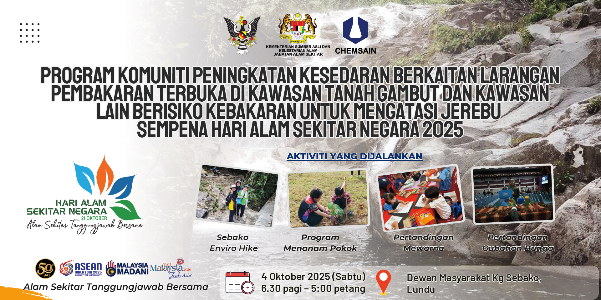 BANNER AKTIVITI PROGRAM KOMUNITI PENINGKATAN KESEDARAN BERKAITAN LARANGAN PEMBAKARAN TERBUKA DI KAWASAN TANAH GAMBUT DAN KAWASAN LAIN BERISIKO KEBAKARAN UNTUK MENGATASI JEREBU SEMPENA HARI ALAM SEKITAR NEGARA 2025 DI DEWAN MASYARAKAT KG. SEBAKO, LUNDU