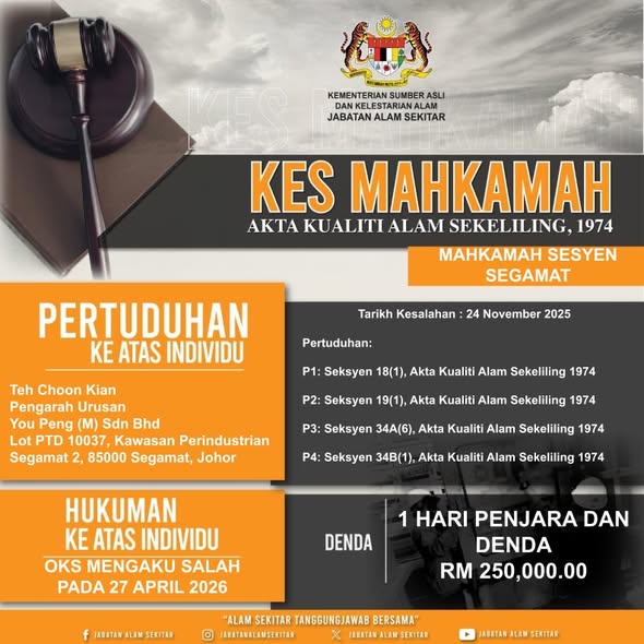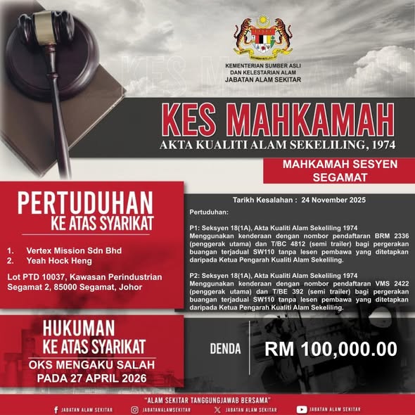 Jabatan Alam Sekitar 1h · SYARIKAT DAN PENGARAH DIDENDA KESELURUHAN RM350,000 SERTA HUKUMAN PENJARA BAGI KESALAHAN PENGURUSAN BUANGAN TERJADUAL SECARA HARAM 27 APRIL 2026, SEGAMAT – Jabatan Alam Sekitar (JAS) Negeri Johor telah berjaya mensabitkan hukuman ke atas dua kes jenayah alam sekitar melibatkan pengurusan buangan terjadual kod SW110 (buangan elektrik dan elektronik) secara haram di Kawasan Perindustrian Segamat 2. Seorang Pengarah Syarikat You Peng (M) Sdn Bhd, Teh Choon Kian berusia 53 tahun telah mengaku bersalah di hadapan Hakim Puan Rahimah binti Abd Majid atas empat (4) pertuduhan di bawah Akta Kualiti Alam Sekeliling 1974 dan telah didenda sebanyak RM250,000 serta hukuman penjara. Mahkamah turut memerintahkan pelucuthakan 400 tan metrik (MT) barang kes buangan terjadual SW110 kepada Kerajaan Malaysia. Dalam kes ini di lokasi kesalahan yang sama, sebuah syarikat pengangkutan iaitu syarikat Vertex Mission Sdn Bhd bersama Pengarahnya, Yeah Hock Heng, telah didenda sebanyak RM100,000 selepas mengaku bersalah atas dua (2) pertuduhan di bawah Seksyen 18(1A) Akta yang sama. Syarikat tersebut didapati menggunakan kenderaan (penggerak utama dan semi-trailer) bernombor pendaftaran BRM 2336 / T/BC 4812 dan VMS 2422 / T/BE 392 untuk pergerakan buangan terjadual SW110 tanpa lesen pembawa yang sah. Mahkamah memerintahkan kedua-dua buah lori tersebut bersama muatan keseluruhan 31 MT buangan terjadual dilucuthakkan kepada Kerajaan Malaysia. Pihak industri dan masyarakat diingatkan agar sentiasa mematuhi Akta Kualiti Alam Sekeliling 1974. JAS tidak akan berkompromi dengan mana-mana pihak yang menjalankan aktiviti kitar semula buangan terjadual tanpa kelulusan EIA dan lesen yang sah, kerana ia berisiko tinggi mencemarkan alam sekitar dan mengancam kesihatan awam. Orang awam digalakkan untuk melaporkan sebarang aktiviti yang mencemarkan alam sekitar melalui saluran rasmi JAS untuk tindakan lanjut.