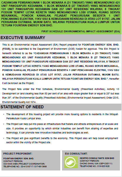 LAPORAN PENILAIAN KESAN KEPADA ALAM SEKELILING (EIA) BAGI CADANGAN PROJEK CADANGAN PEMBANGUNAN 1 BLOK MENARA A (31 TINGKAT) YANG MENGANDUNGI 421 UNIT PANGSAPURI KEDIAMAN, 1 BLOK MENARA B (27 TINGKAT) YANG MENGANDUNGI 131 UNIT PANGSAPURI KEDIAMAN DAN 237 UNIT RESIDENSI WILAYAH, 8 TINGKAT PODIUM TEMPAT LETAK KERETA YANG MENGANDUNGI LOBI UTAMA, RUAMG SERVIS MEKANIKAL, PONDOK KAWALAN, PEJABAT PENGURUSAN BESERTA 1 UNIT PENCAWANG ELEKTRIK, 111KV SSU & KEMUDAHAN REKREASI DI ATAS LOT 81767, JALAN PERSIARAN DUTAMAS, MUKIM BATU, WILAYAH PERSEKUTUAN KUALA LUMPUR