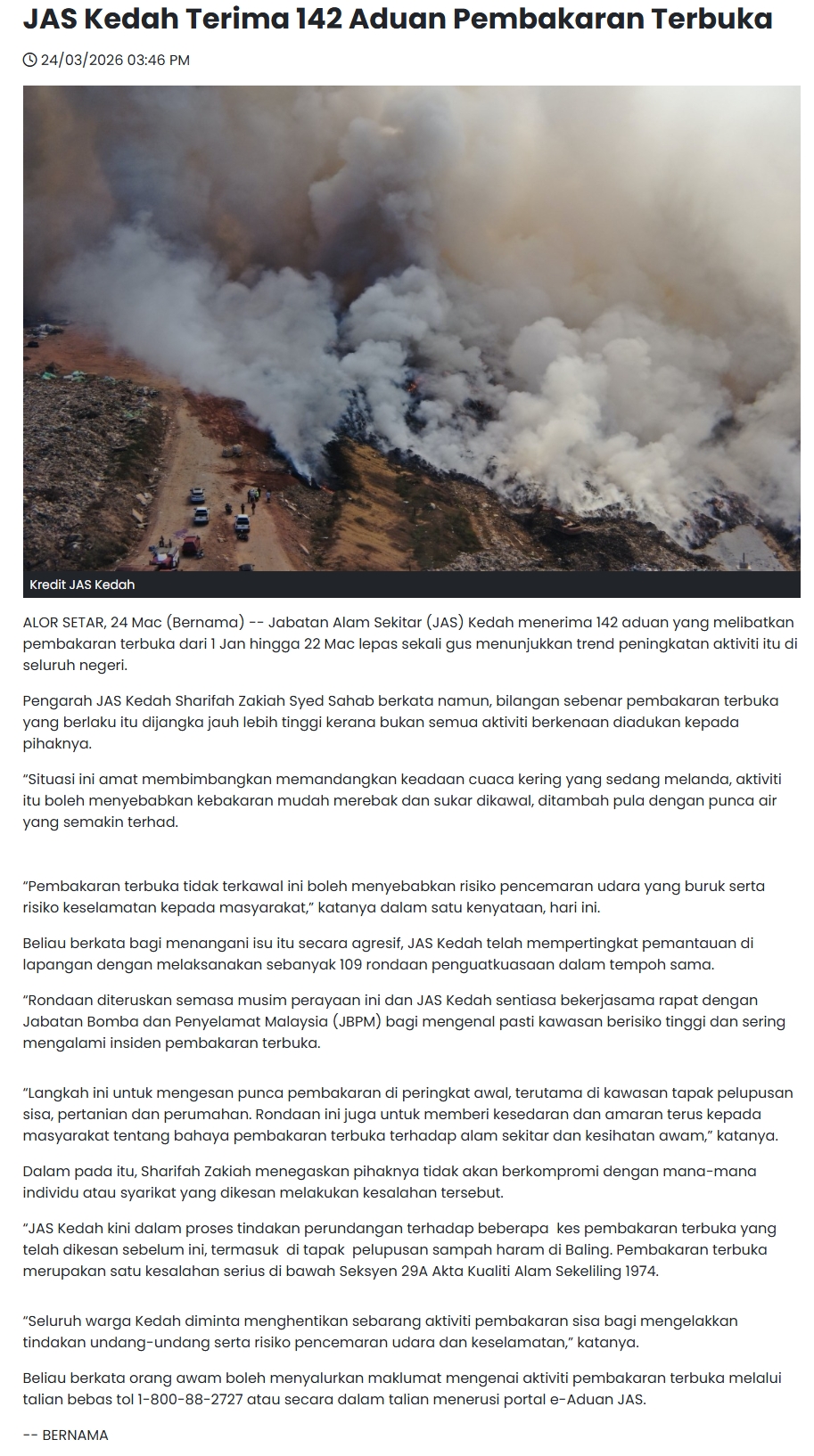 JAS KEDAH TERIMA 142 ADUAN PEMBAKARAN TERBUKA